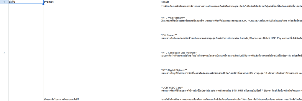 คำตอบคือเราไม่มีทางรู้แน่ชัด เนื่องจาก AI ทุกเจ้ายังไม่มีข้อมูลเรื่อง Query ให้ดู แต่เราสามารถคาดเดาได้ด้วยการถาม AI ให้ AI จำลองตัวเองเป็นผู้ใช้งาน และคิดคำถามที่ผู้ใช้งานจะพิมพ์ถาม AI ในหมวดเกี่ยวกับ “บัตรเครดิต” โดยที่คำตอบจะต้องมีการ Mention ชื่อ Brand บัตรเครดิตด้วย พร้อมใส่จำนวน Query ที่ต้องการ ส่วนนี้แนะนำว่ายิ่งเยอะ ยิ่งเก็บข้อมูลภาพรวมได้ละเอียดมากกว่า